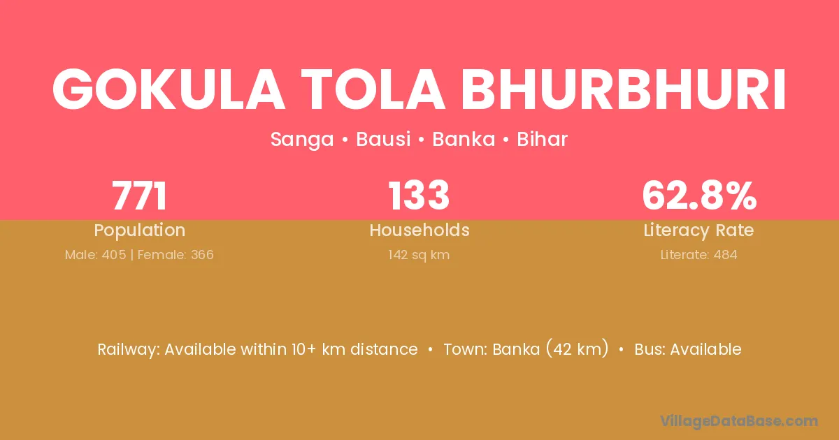 Banka (42 km) is the nearest town to Gokula Tola Bhurbhuri village for major economic activities and is located approximately 42 km away.