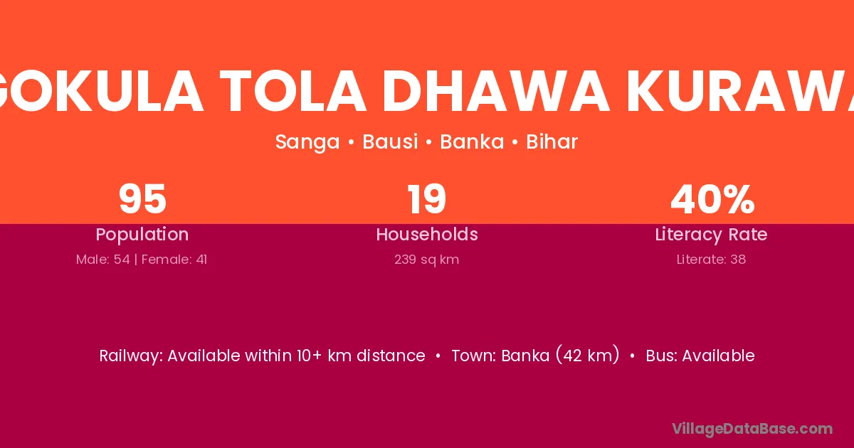 Banka (42 km) is the nearest town to Gokula Tola Dhawa Kurawa village for major economic activities and is located approximately 42 km away.