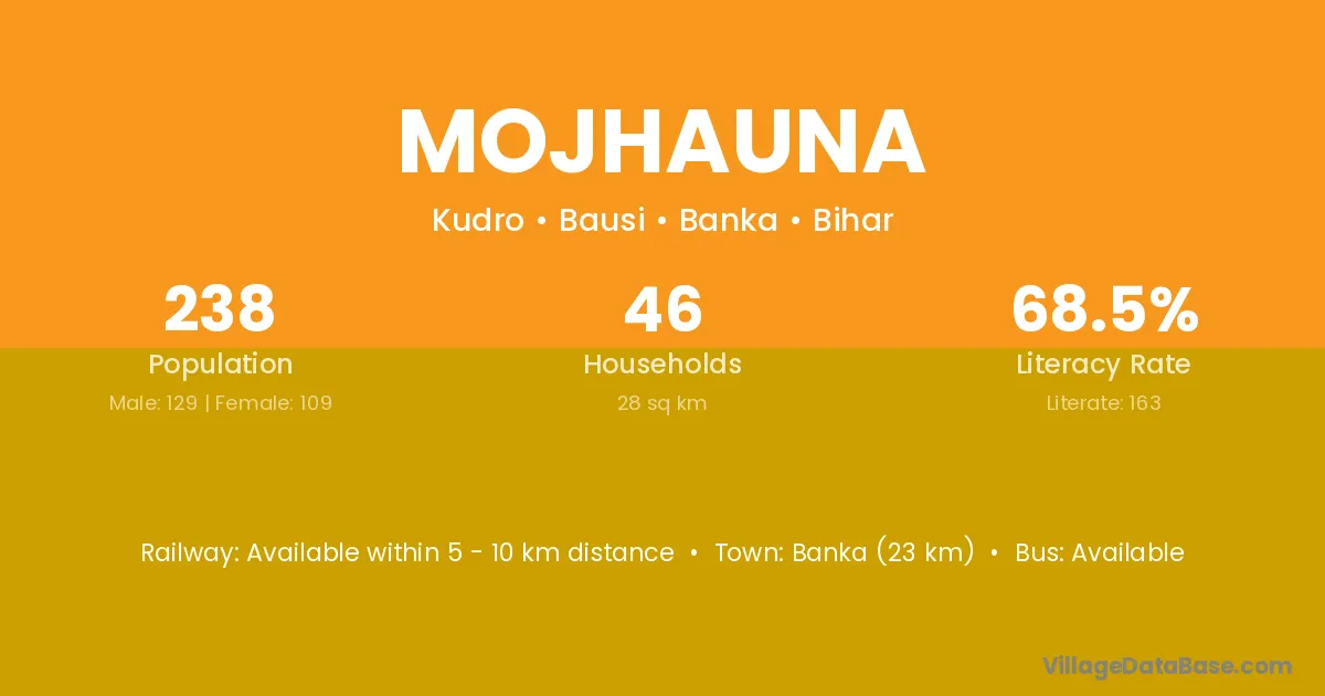 Banka (23 km) is the nearest town to Mojhauna village for major economic activities and is located approximately 23 km away.