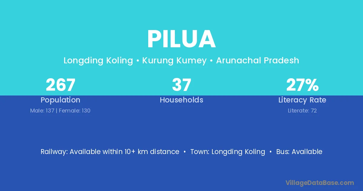 The literacy rate of Pilua village is 60.56%. Male literacy stands at 68.85% and female literacy at 51.53%.