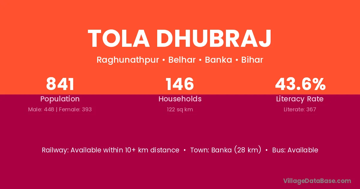 Banka (28 km) is the nearest town to Tola Dhubraj village for major economic activities and is located approximately 28 km away.
