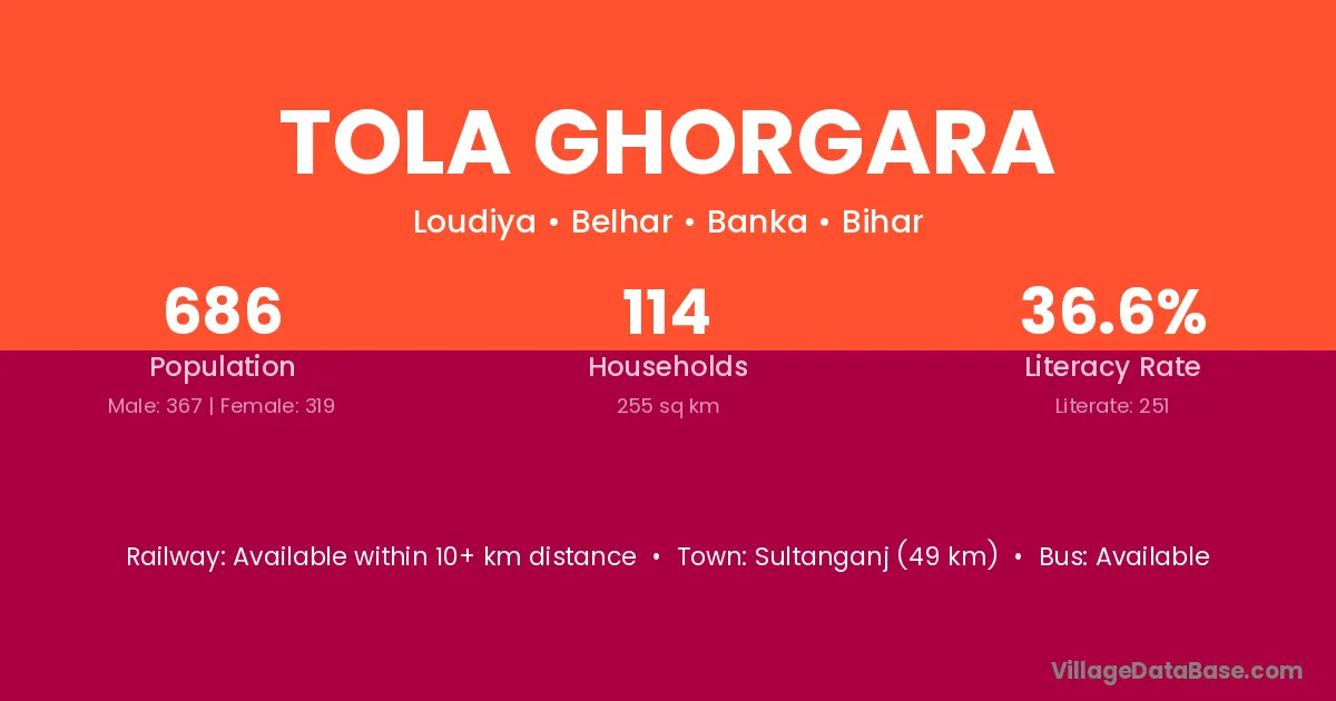 Sultanganj (49 km) is the nearest town to Tola Ghorgara village for major economic activities and is located approximately 49 km away.