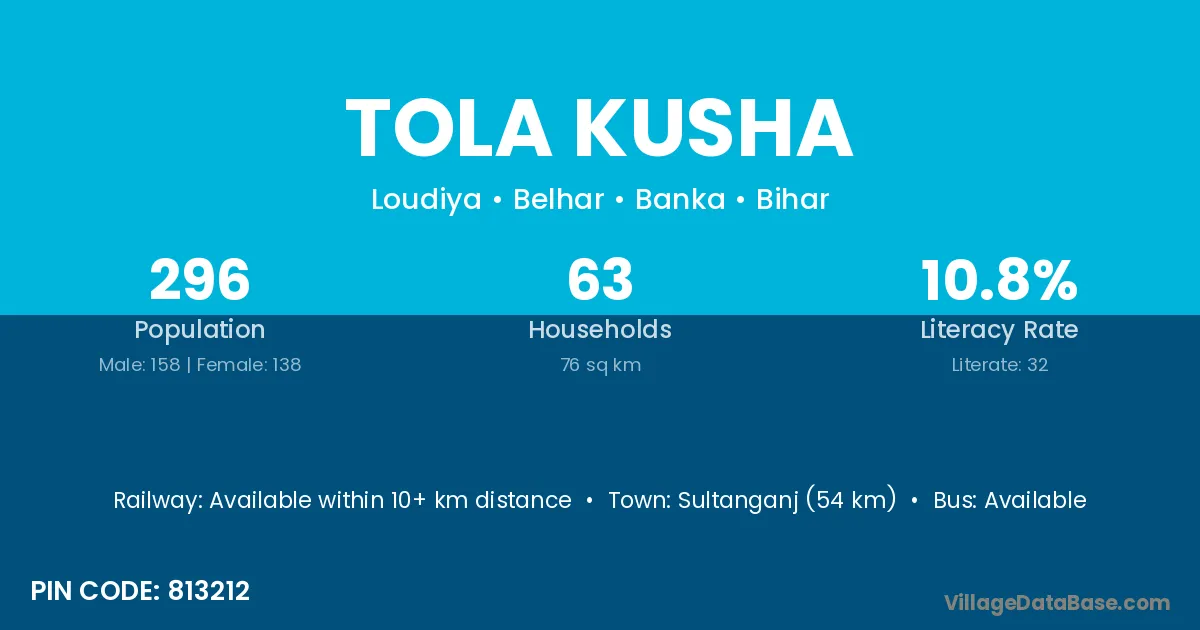 Sultanganj (54 km) is the nearest town to Tola Kusha village for major economic activities and is located approximately 54 km away.