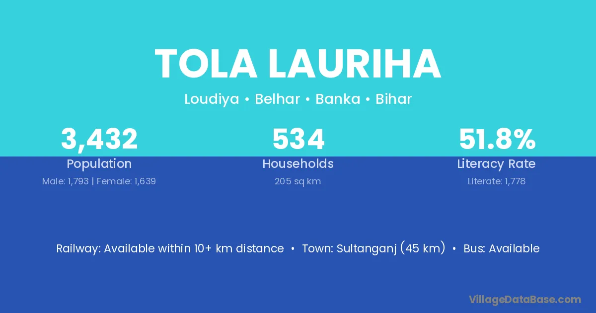 Sultanganj (45 km) is the nearest town to Tola Lauriha village for major economic activities and is located approximately 45 km away.
