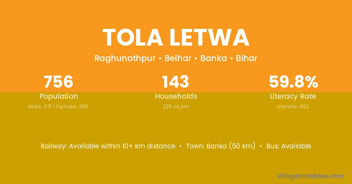 Banka (50 km) is the nearest town to Tola Letwa village for major economic activities and is located approximately 50 km away.