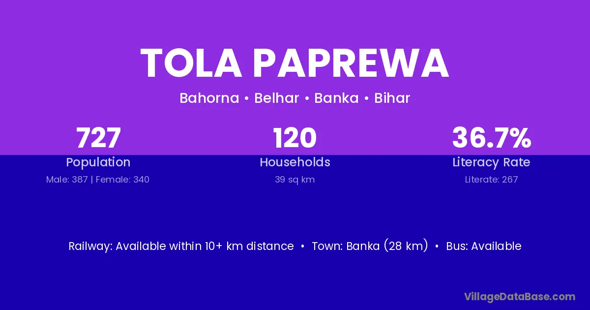 Banka (28 km) is the nearest town to Tola Paprewa village for major economic activities and is located approximately 28 km away.