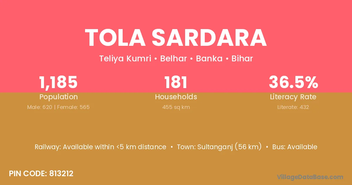 Sultanganj (56 km) is the nearest town to Tola Sardara village for major economic activities and is located approximately 56 km away.