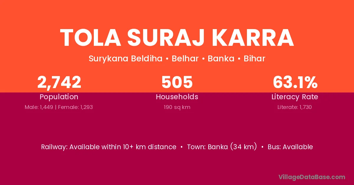 Banka (34 km) is the nearest town to Tola Suraj Karra village for major economic activities and is located approximately 34 km away.