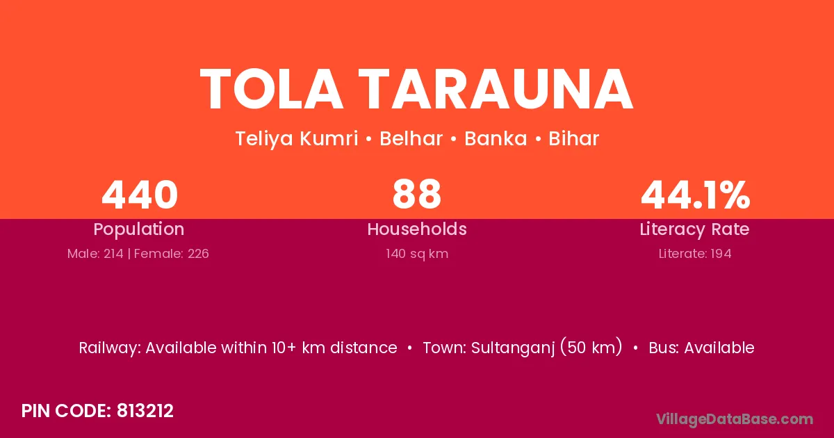 Tola Tarauna village has a total population of 440 people, of which 214 are males and 226 are females.