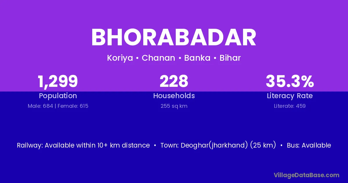 Deoghar(jharkhand) (25 km) is the nearest town to Bhorabadar village for major economic activities and is located approximately 25 km away.