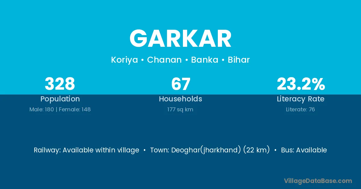Deoghar(jharkhand) (22 km) is the nearest town to Garkar village for major economic activities and is located approximately 22 km away.