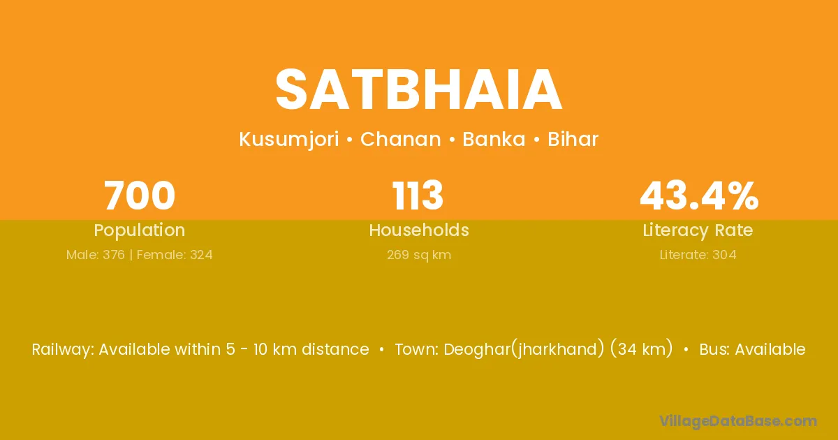 Deoghar(jharkhand) (34 km) is the nearest town to Satbhaia village for major economic activities and is located approximately 34 km away.