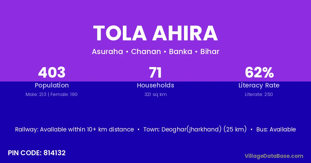 Deoghar(jharkhand) (25 km) is the nearest town to Tola Ahira village for major economic activities and is located approximately 25 km away.