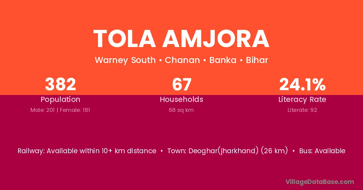 Deoghar(jharkhand) (26 km) is the nearest town to Tola Amjora village for major economic activities and is located approximately 26 km away.