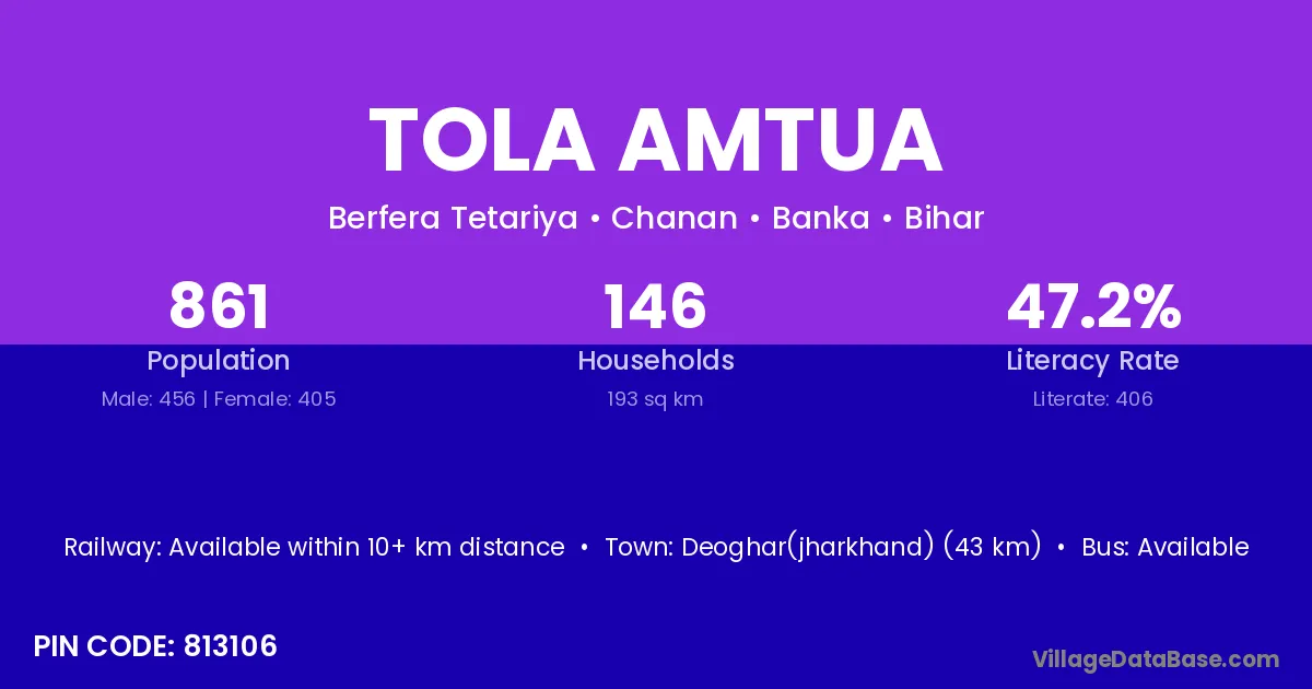 Deoghar(jharkhand) (43 km) is the nearest town to Tola Amtua village for major economic activities and is located approximately 43 km away.