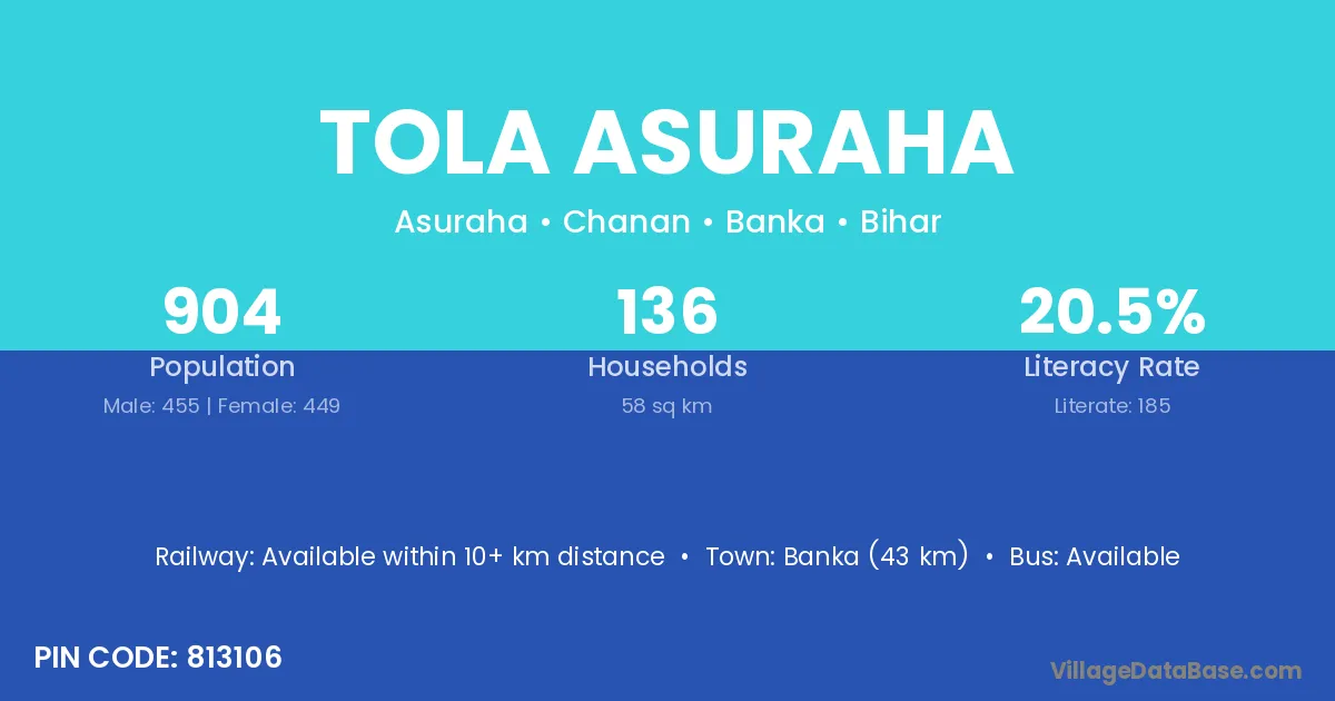 Banka (43 km) is the nearest town to Tola Asuraha village for major economic activities and is located approximately 43 km away.