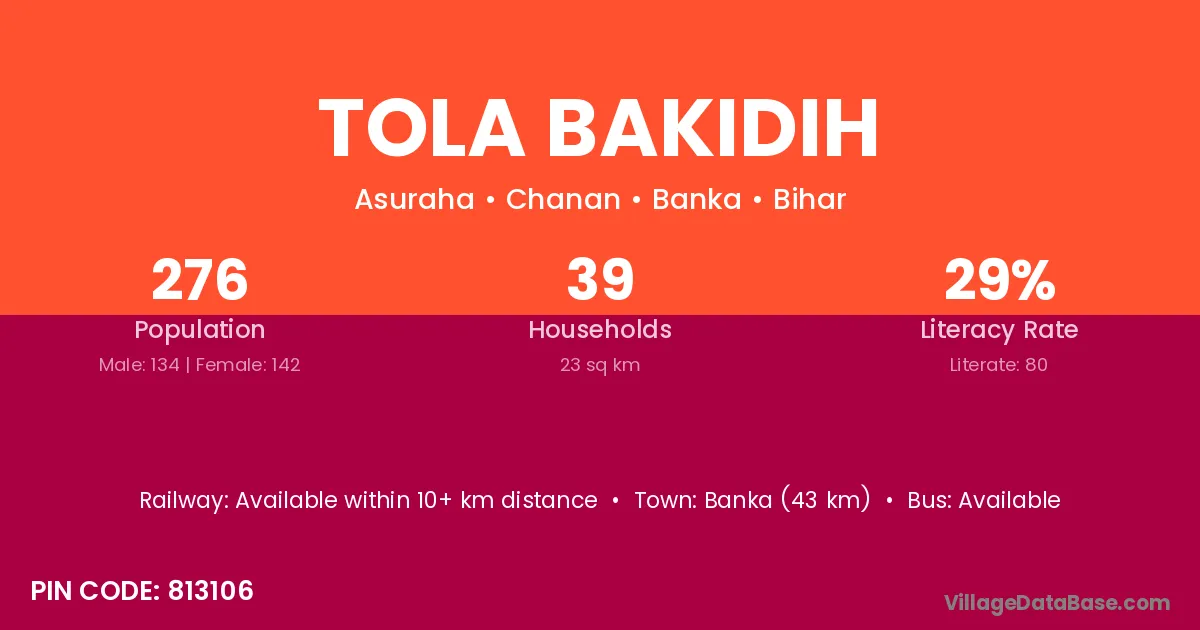 Banka (43 km) is the nearest town to Tola Bakidih village for major economic activities and is located approximately 43 km away.