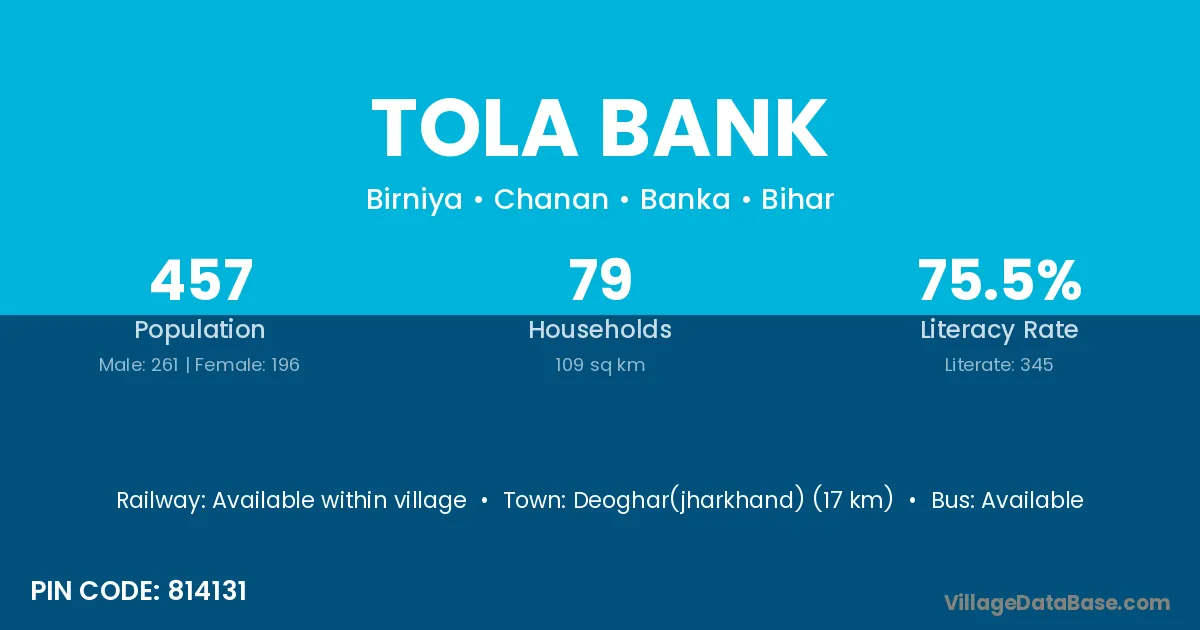 Deoghar(jharkhand) (17 km) is the nearest town to Tola Bank village for major economic activities and is located approximately 17 km away.