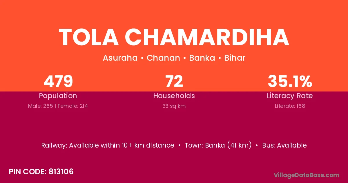 Banka (41 km) is the nearest town to Tola Chamardiha village for major economic activities and is located approximately 41 km away.
