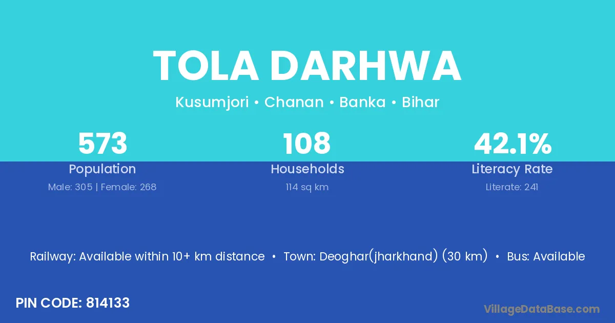 Deoghar(jharkhand) (30 km) is the nearest town to Tola Darhwa village for major economic activities and is located approximately 30 km away.