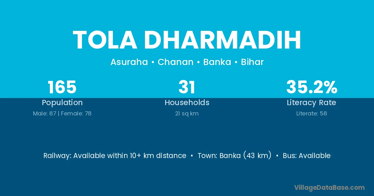 Banka (43 km) is the nearest town to Tola Dharmadih village for major economic activities and is located approximately 43 km away.