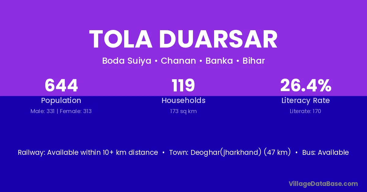 Deoghar(jharkhand) (47 km) is the nearest town to Tola Duarsar village for major economic activities and is located approximately 47 km away.