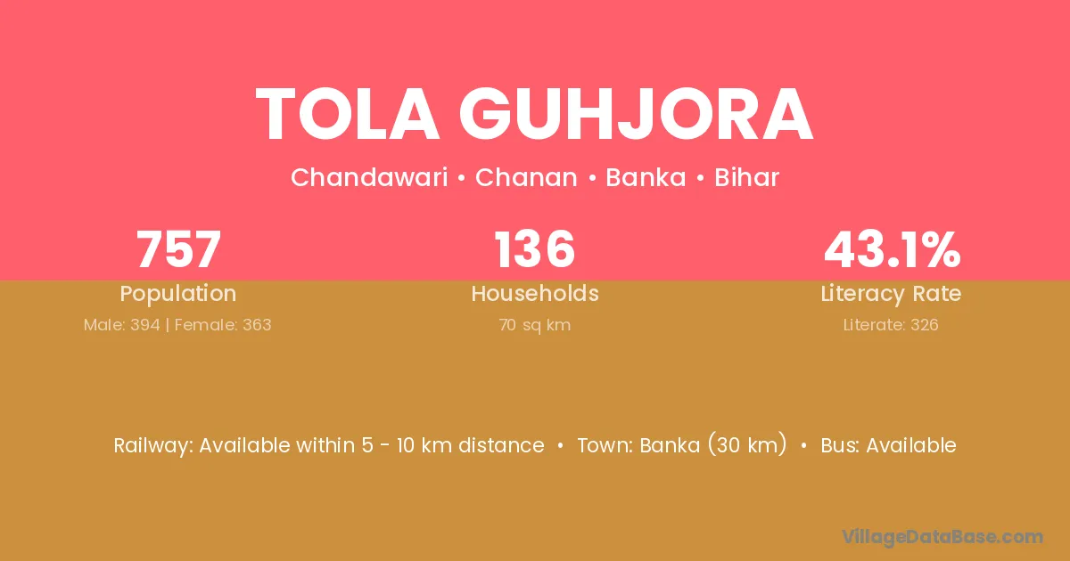 Banka (30 km) is the nearest town to Tola Guhjora village for major economic activities and is located approximately 30 km away.