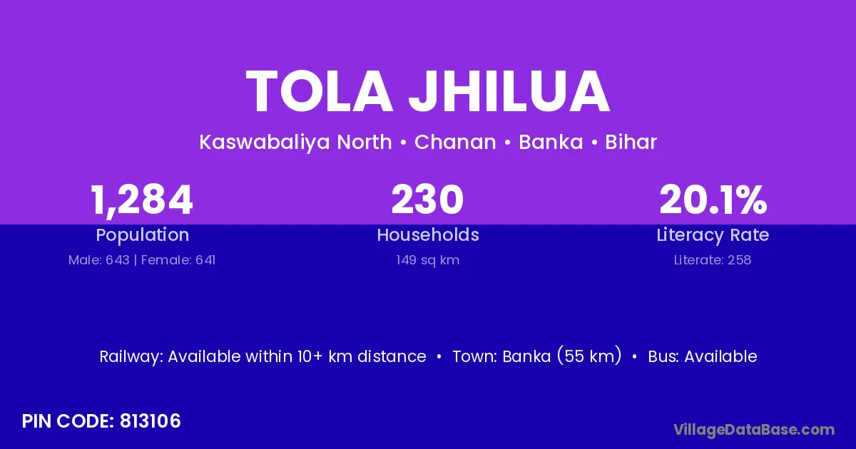 Banka (55 km) is the nearest town to Tola Jhilua village for major economic activities and is located approximately 55 km away.