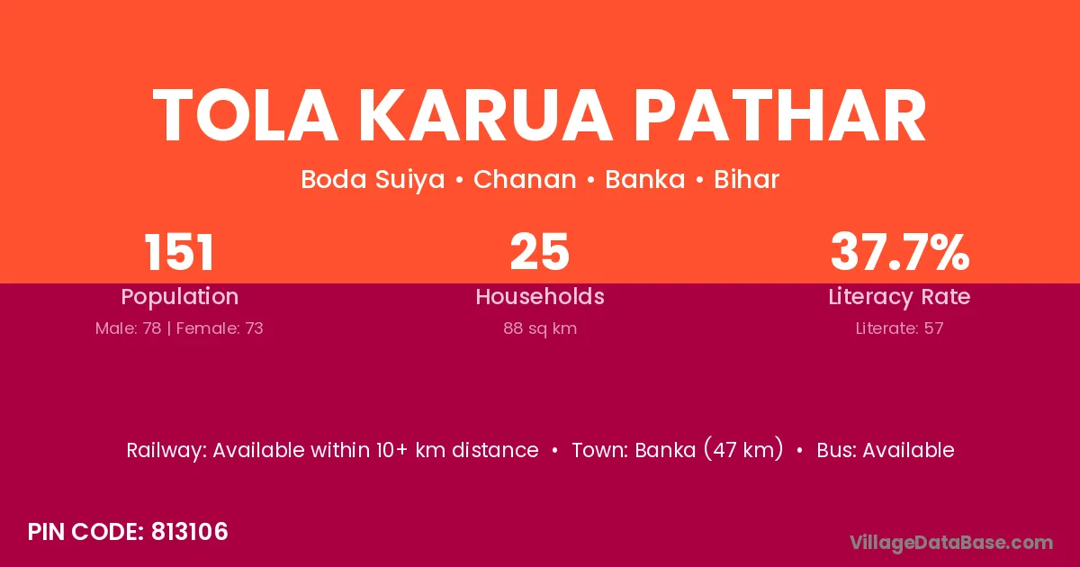 Banka (47 km) is the nearest town to Tola Karua Pathar village for major economic activities and is located approximately 47 km away.