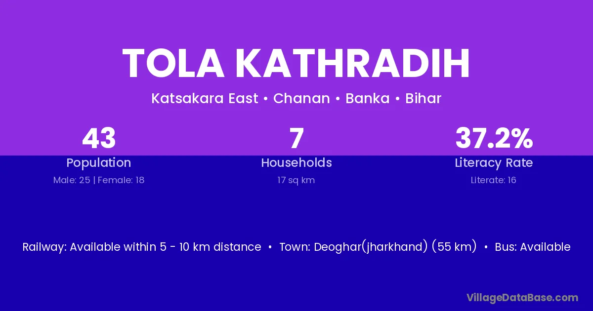 Deoghar(jharkhand) (55 km) is the nearest town to Tola Kathradih village for major economic activities and is located approximately 55 km away.