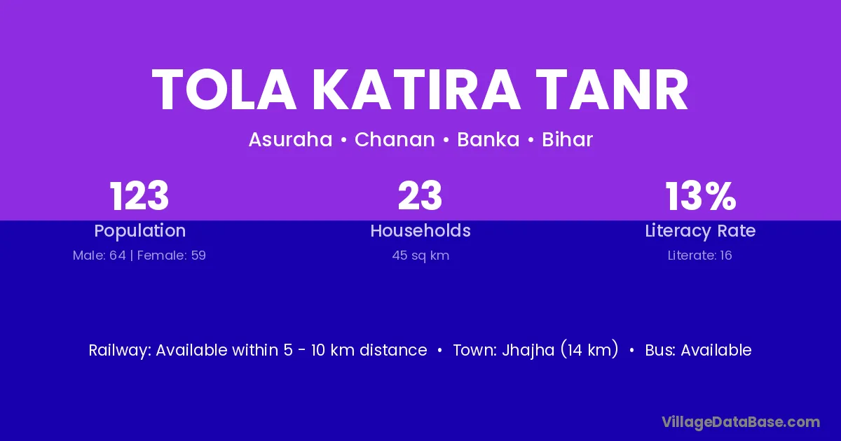 Jhajha (14 km) is the nearest town to Tola Katira Tanr village for major economic activities and is located approximately 14 km away.