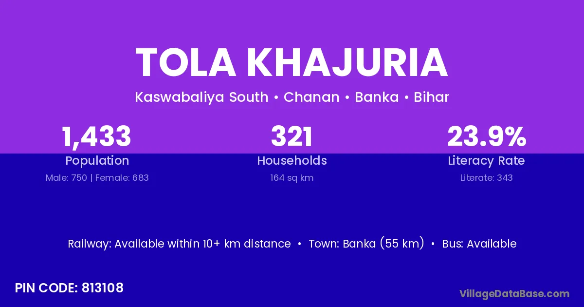 Banka (55 km) is the nearest town to Tola Khajuria village for major economic activities and is located approximately 55 km away.