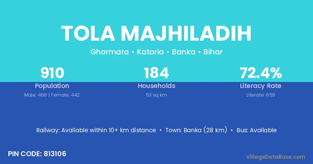 Banka (42 km) is the nearest town to Tola Majhiladih village for major economic activities and is located approximately 42 km away.