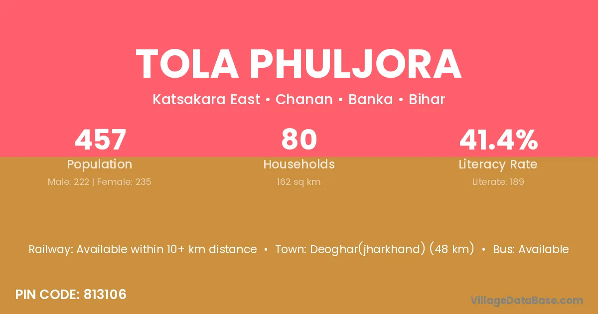 Deoghar(jharkhand) (48 km) is the nearest town to Tola Phuljora village for major economic activities and is located approximately 48 km away.