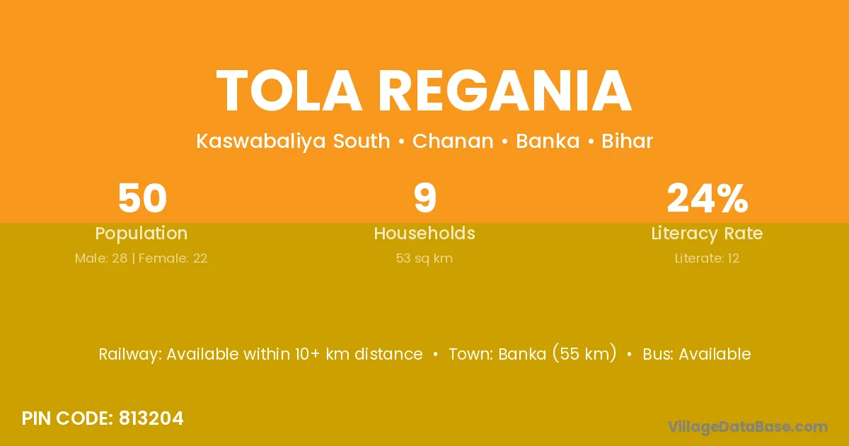 Banka (55 km) is the nearest town to Tola Regania village for major economic activities and is located approximately 55 km away.
