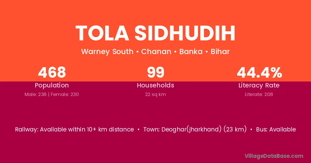 Deoghar(jharkhand) (23 km) is the nearest town to Tola Sidhudih village for major economic activities and is located approximately 23 km away.