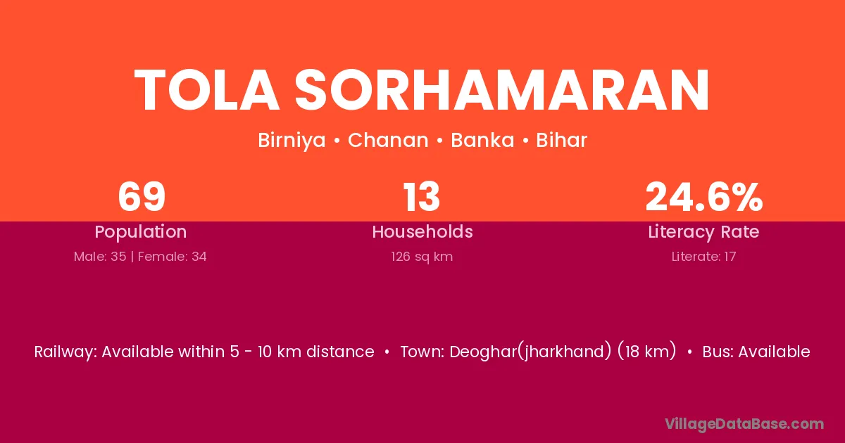 Tola Sorhamaran village has a total population of 69 people, of which 35 are males and 34 are females.