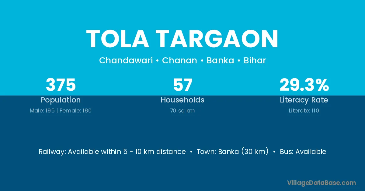Banka (30 km) is the nearest town to Tola Targaon village for major economic activities and is located approximately 30 km away.