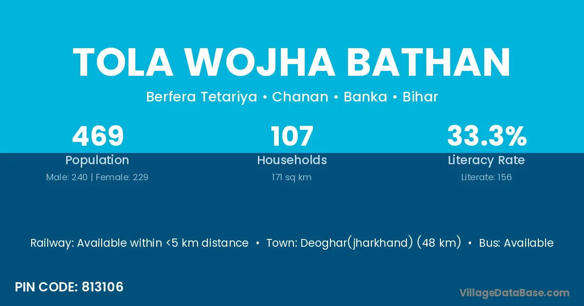 Deoghar(jharkhand) (48 km) is the nearest town to Tola Wojha Bathan village for major economic activities and is located approximately 48 km away.