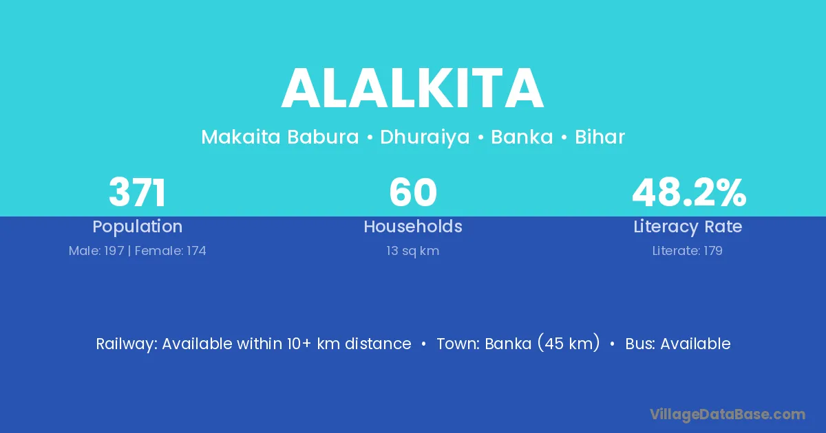 Banka (45 km) is the nearest town to Alalkita village for major economic activities and is located approximately 45 km away.