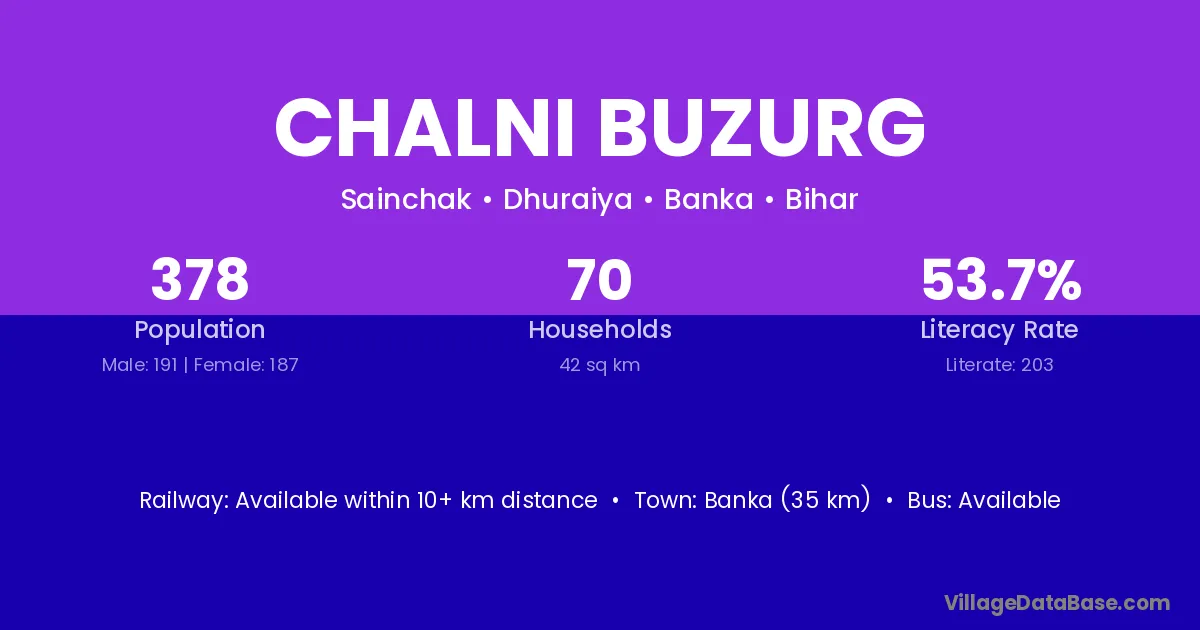 Banka (35 km) is the nearest town to Chalni Buzurg village for major economic activities and is located approximately 35 km away.