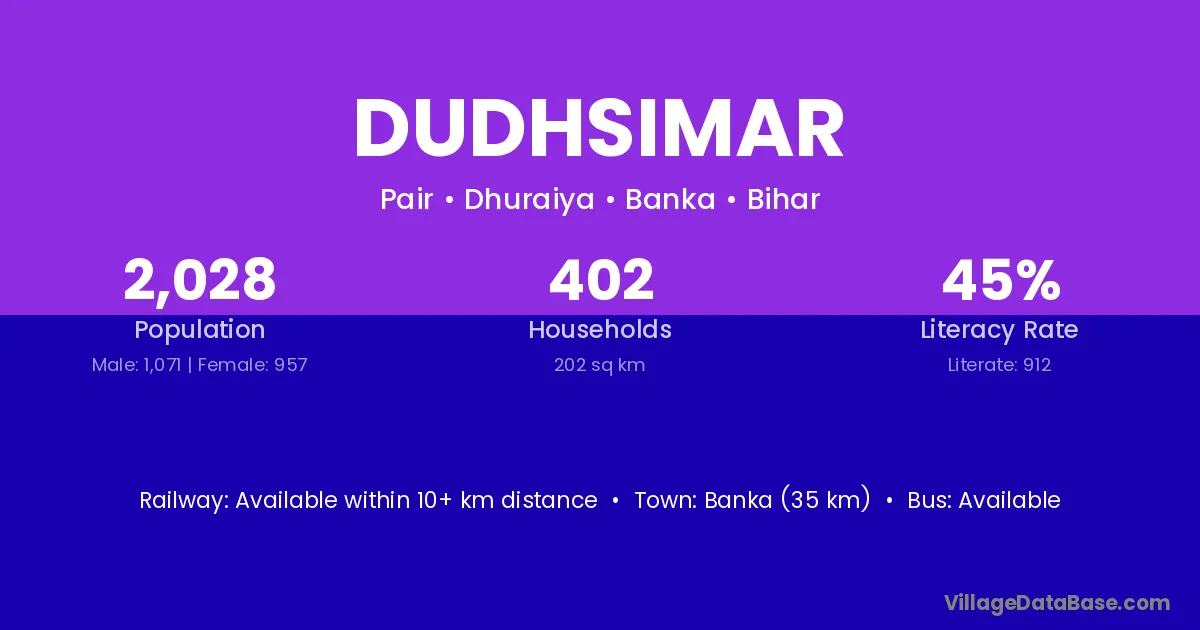 Banka (35 km) is the nearest town to Dudhsimar village for major economic activities and is located approximately 35 km away.