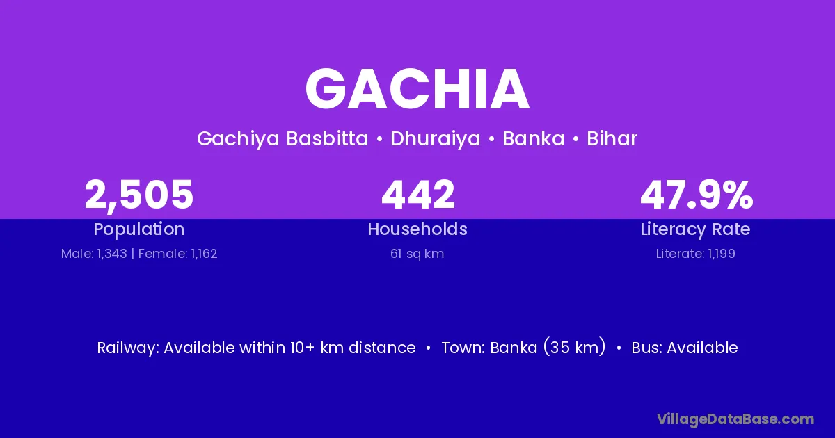 Banka (35 km) is the nearest town to Gachia village for major economic activities and is located approximately 35 km away.