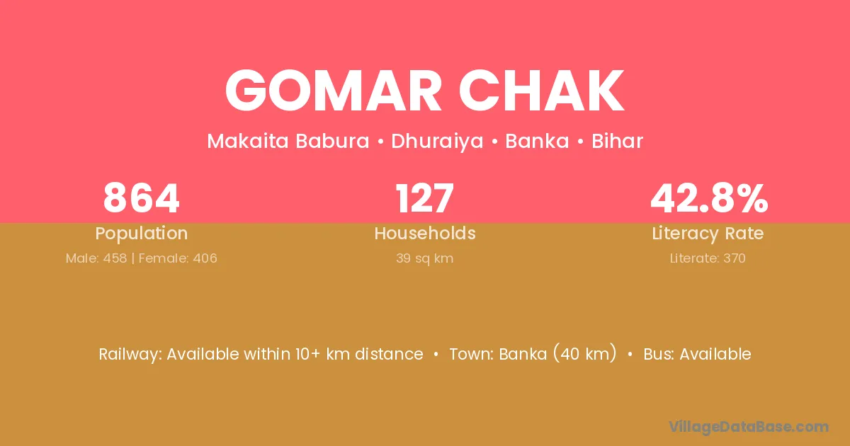Banka (40 km) is the nearest town to Gomar Chak village for major economic activities and is located approximately 40 km away.