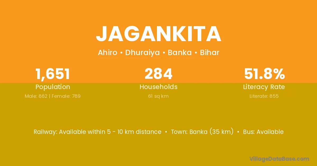 Banka (35 km) is the nearest town to Jagankita village for major economic activities and is located approximately 35 km away.