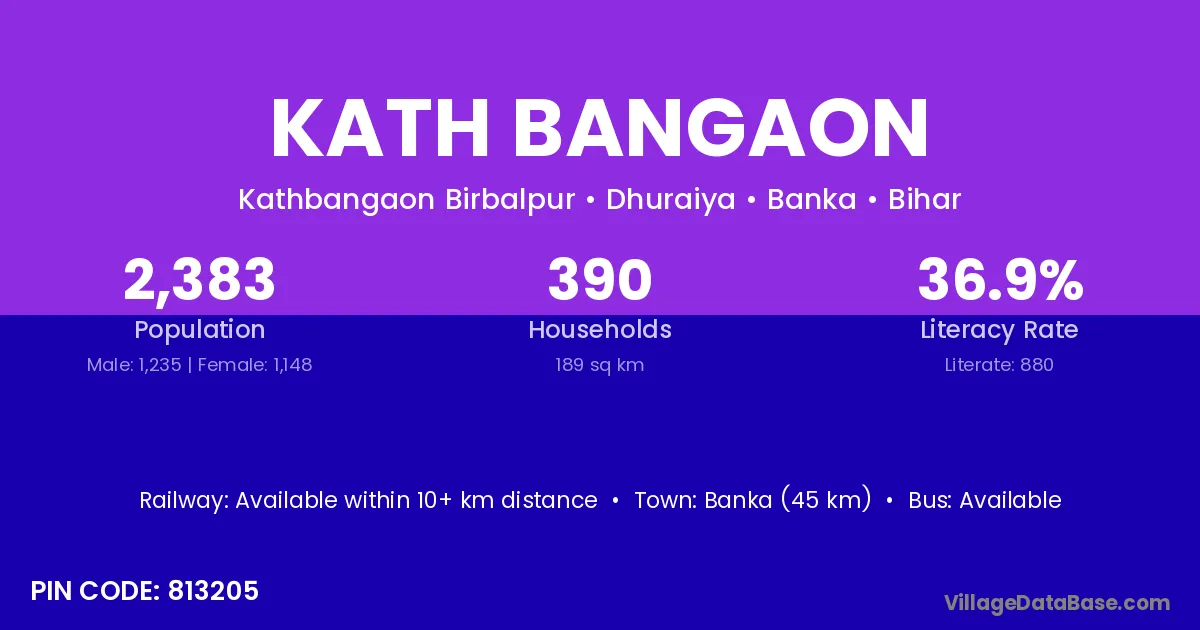 Banka (45 km) is the nearest town to Kath Bangaon village for major economic activities and is located approximately 45 km away.