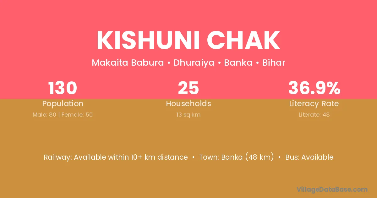 Banka (48 km) is the nearest town to Kishuni Chak village for major economic activities and is located approximately 48 km away.