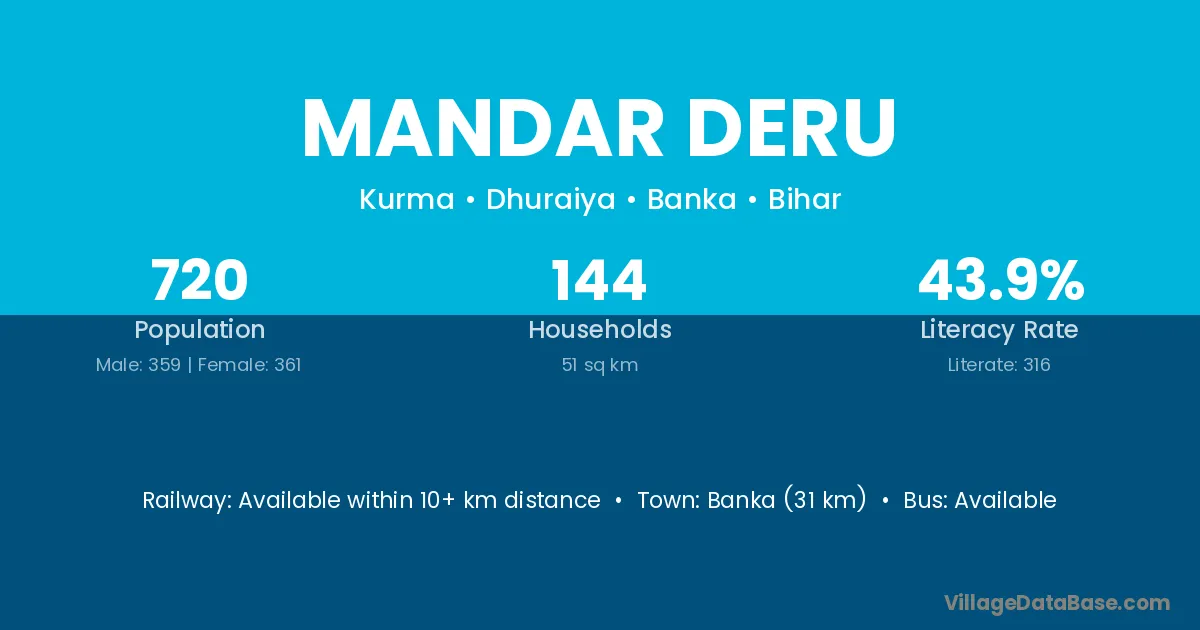 Banka (31 km) is the nearest town to Mandar Deru village for major economic activities and is located approximately 31 km away.