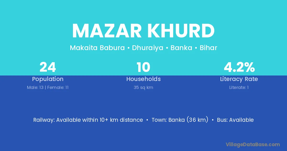 Banka (36 km) is the nearest town to Mazar Khurd village for major economic activities and is located approximately 36 km away.