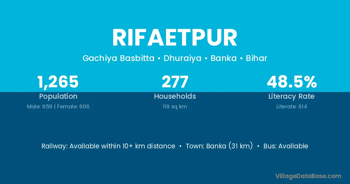 Banka (31 km) is the nearest town to Rifaetpur village for major economic activities and is located approximately 31 km away.